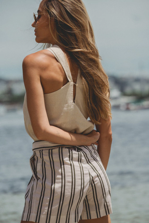 Peça feita em 100% linho, fibra 100% natural, trazendo frescor e respirabilidade às peças. Possui caimento naturalmente mais estruturado do que outros tecidos, o que dá um toque de elegância ao look. É considerado também um dos tecidos mais sustentáveis do mundo.
