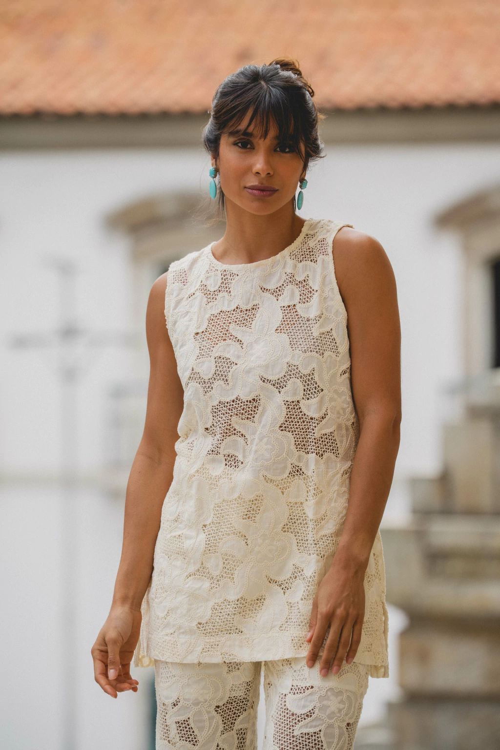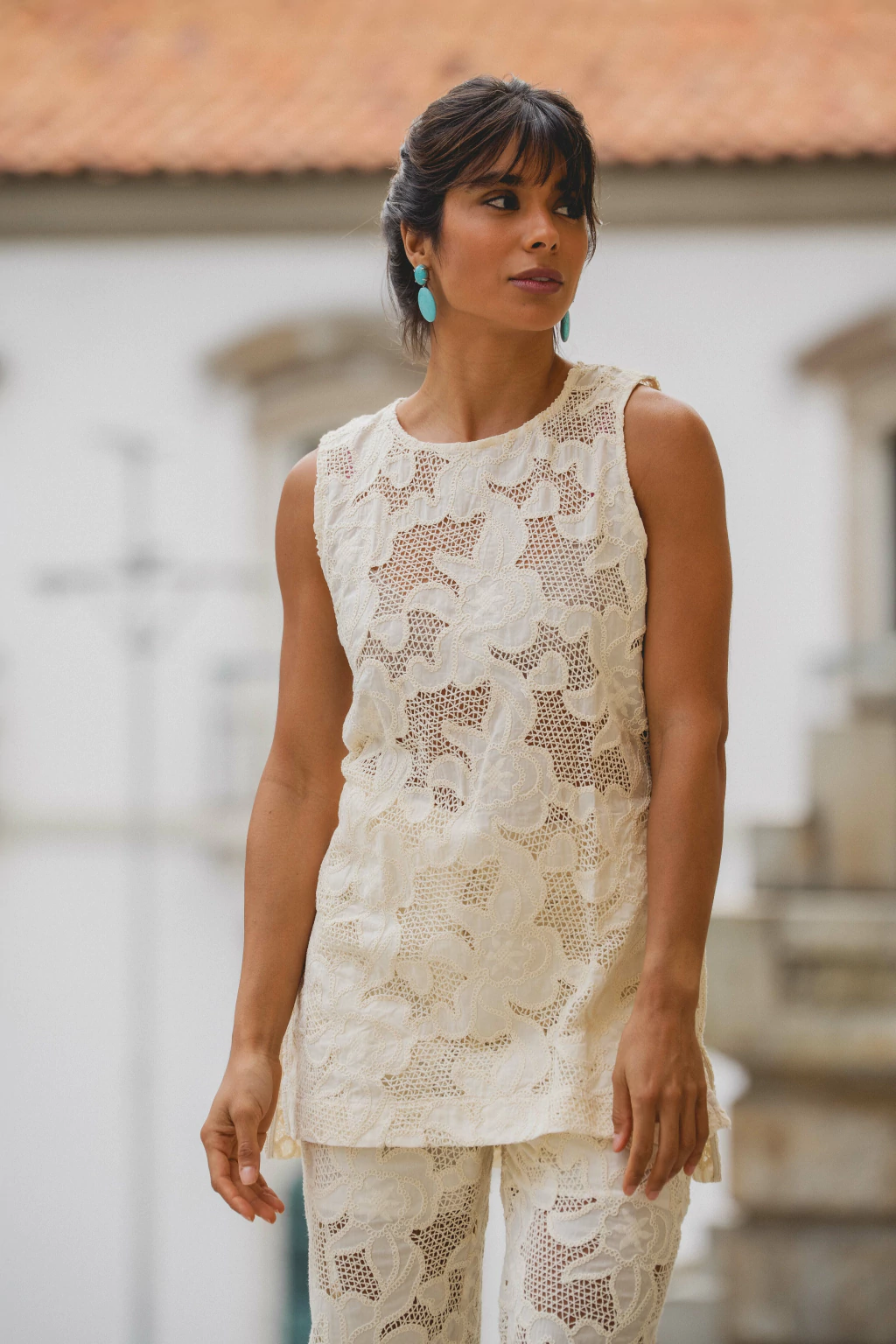Blusa sem mangas em sofisticada renda guipure 100% algodão, com shape reto e abertura nas laterais.