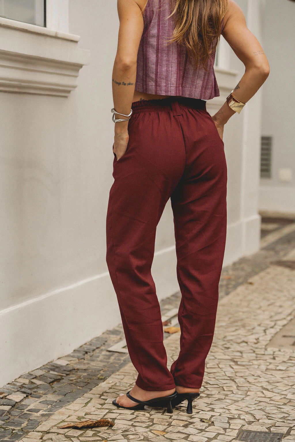 Calça de cintura média com botões forrados do mesmo tecido e elástico no cós costas. Possui modelagem estilo cenoura e bolso embutido nas laterais.
