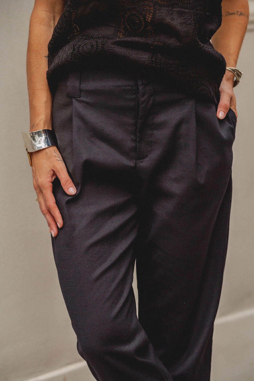 Calça de cintura média com botões forrados do mesmo tecido e elástico no cós costas. Possui modelagem estilo cenoura e bolso embutido nas laterais.