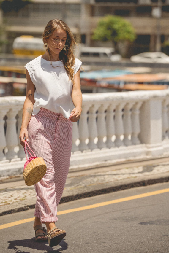 Calça de cintura média com botões mesclados caramelos e elástico no cós costas. Possui modelagem estilo cenoura e bolso embutido nas laterais.