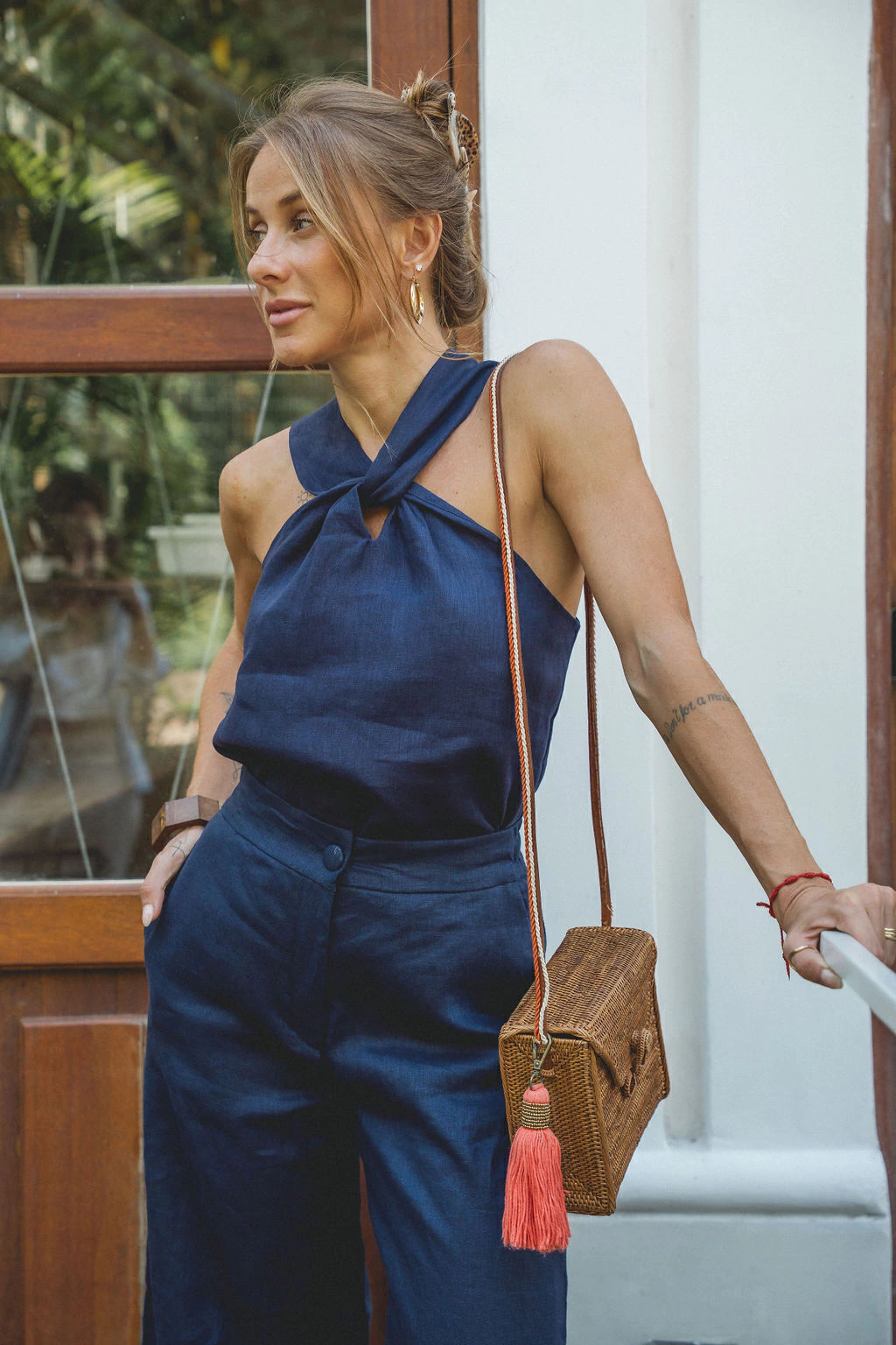 Peça feita em 100% linho, fibra 100% natural, trazendo frescor e respirabilidade às peças. Possui caimento naturalmente mais estruturado do que outros tecidos, o que dá um toque de elegância ao look. É considerado também um dos tecidos mais sustentáveis do mundo.