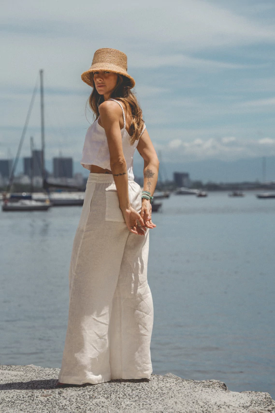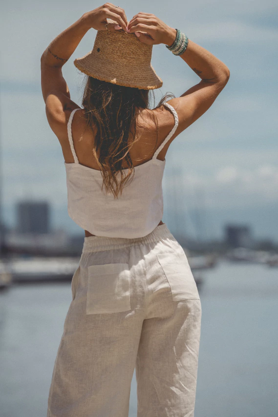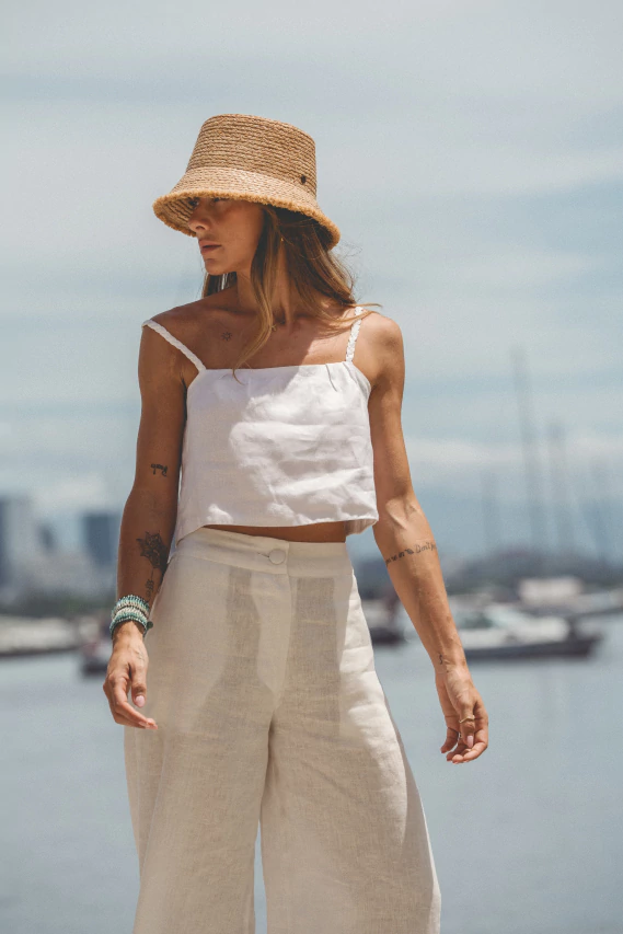 Peça feita em 100% linho, fibra 100% natural, trazendo frescor e respirabilidade às peças. Possui caimento naturalmente mais estruturado do que outros tecidos, o que dá um toque de elegância ao look. É considerado também um dos tecidos mais sustentáveis do mundo.