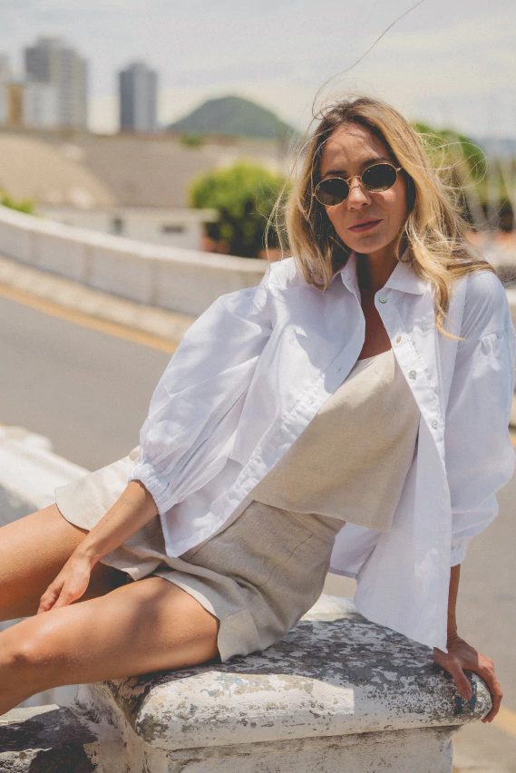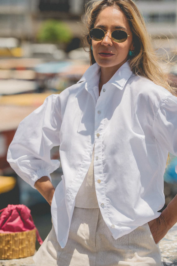 Camisa de manga bufante comprida com modelagem mais reta. Possui elástico nos punhos e abotoamento em madrepérola.