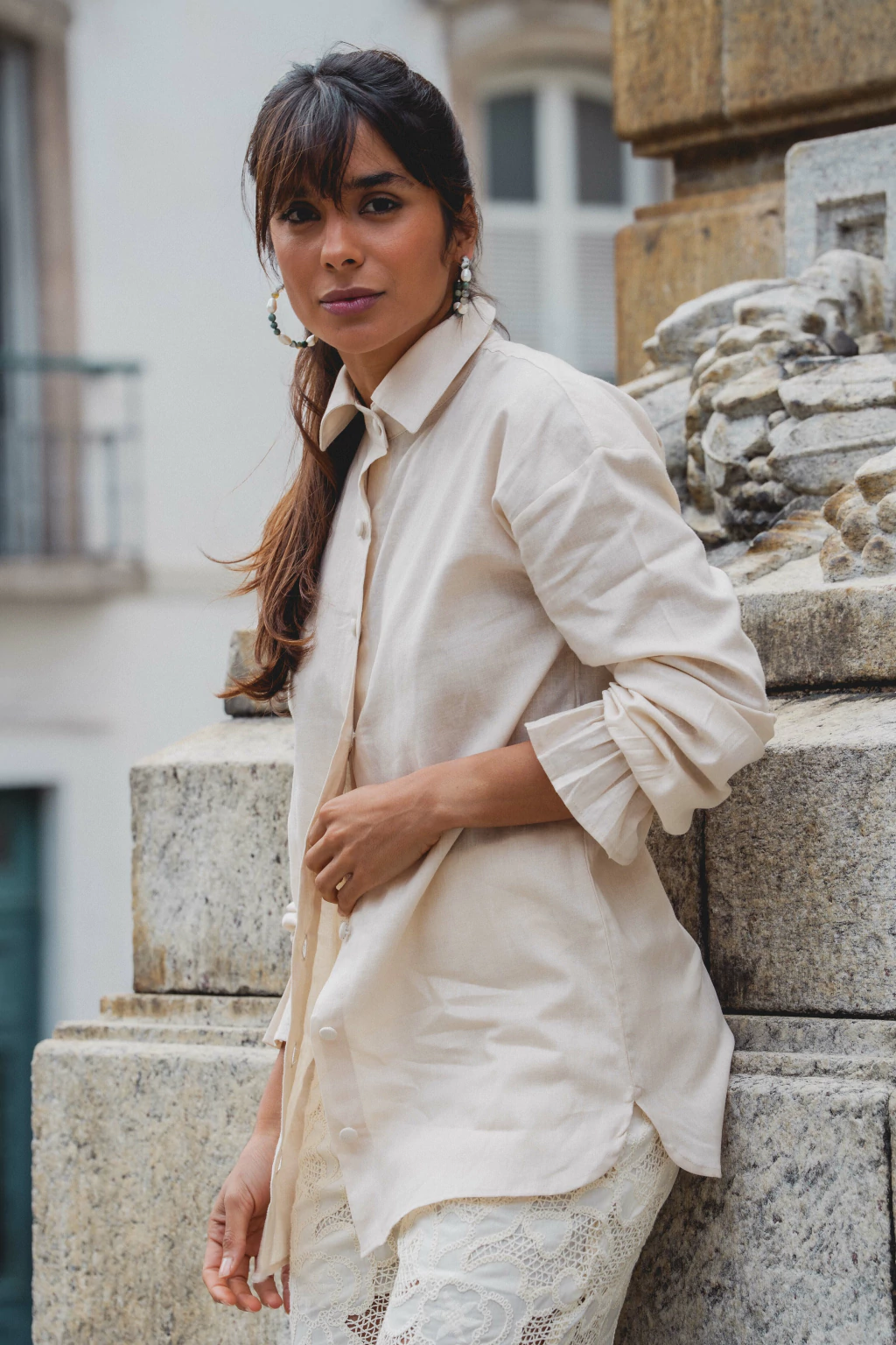 Peça feita em linho com algodão, fibras 100% naturais, trazendo frescor e respirabilidade às peças. Possui caimento fluido e leve.