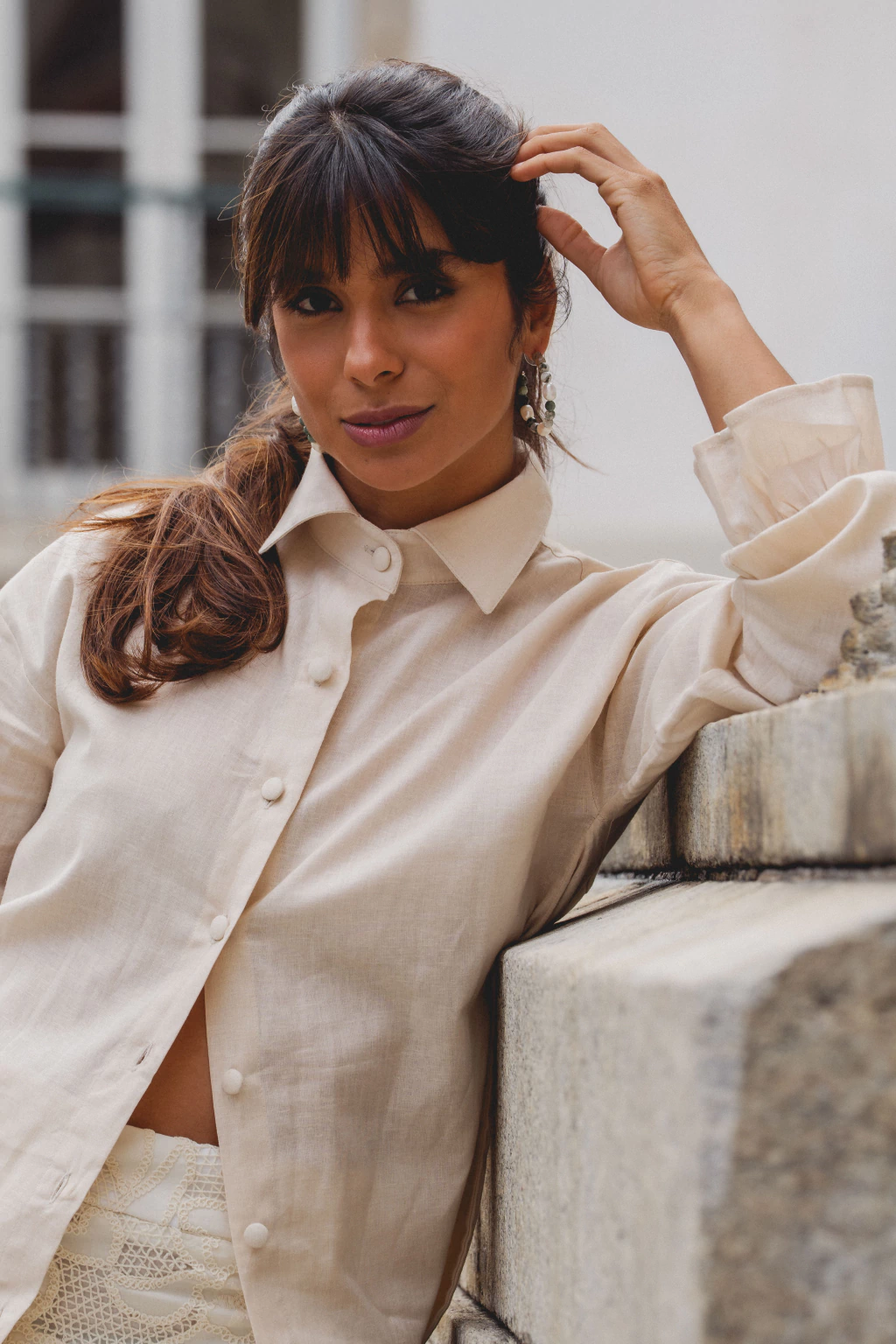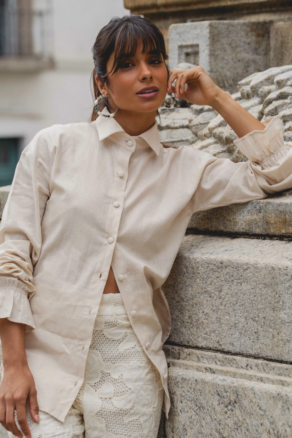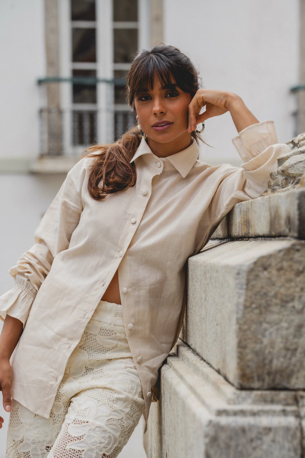 Camisa com modelagem soltinha em linho com algodão, cavas deslocadas e detalhe de lastex nos punhos. Possui abotoamento frontal com botões forrados.