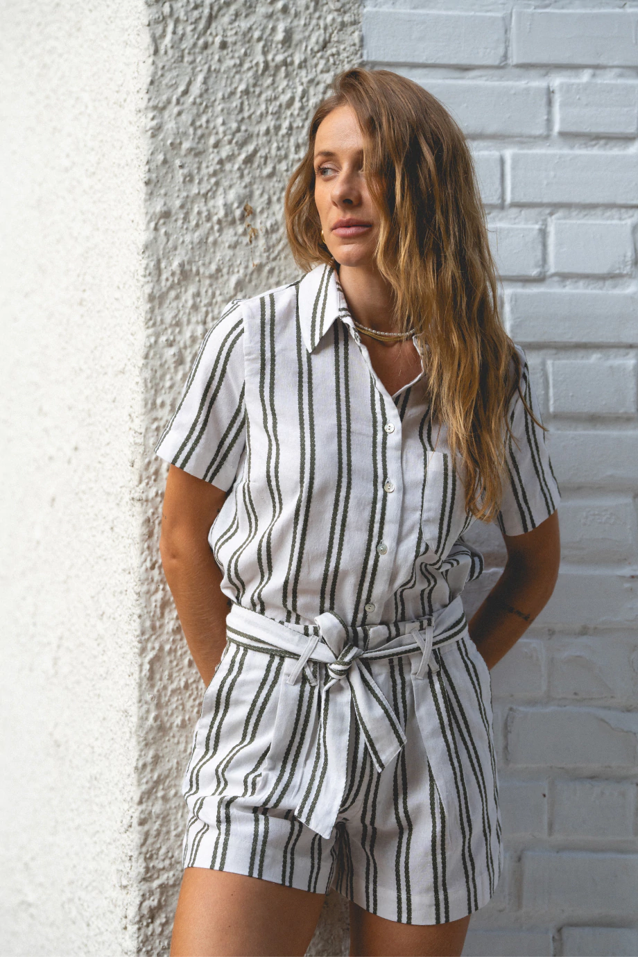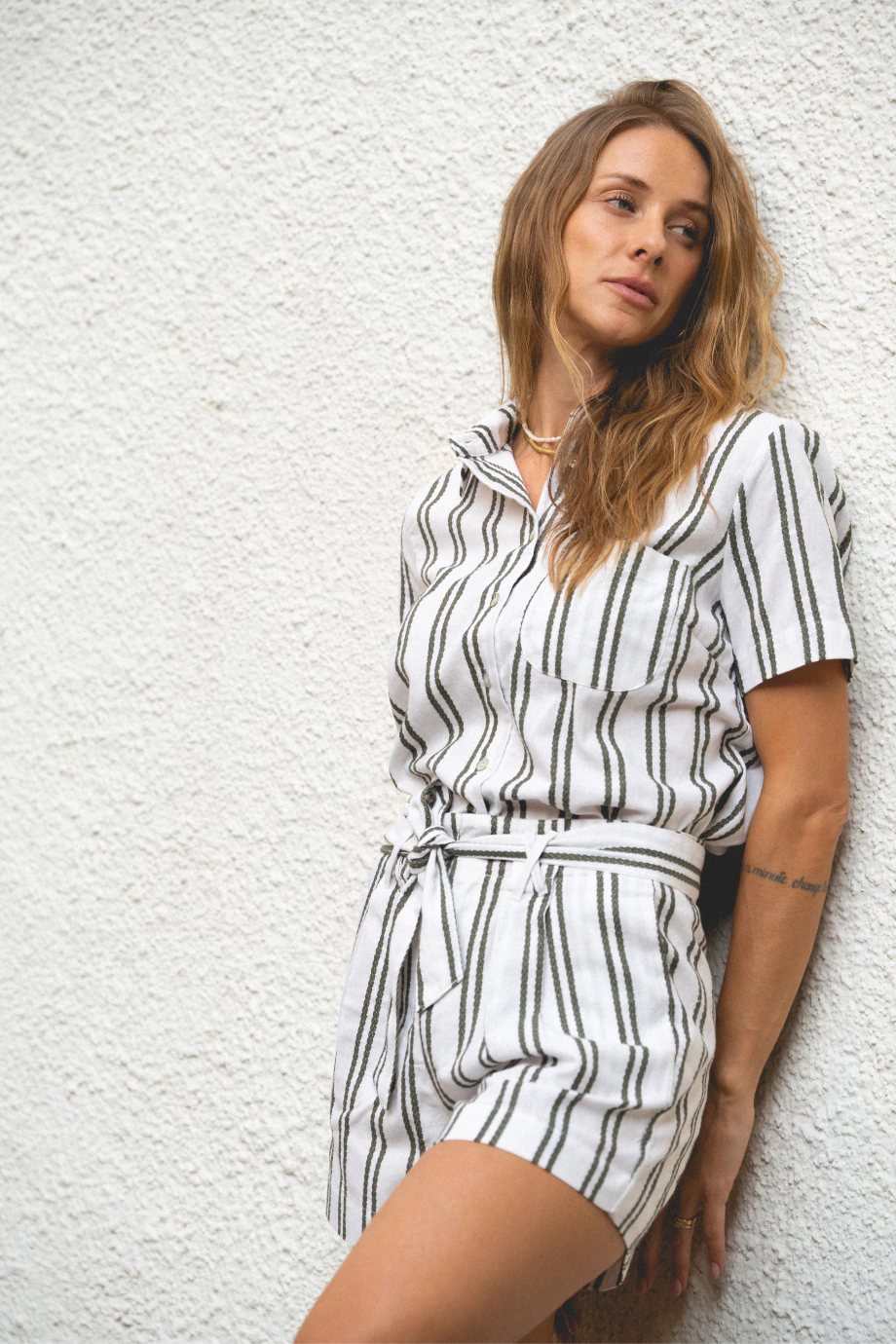 Camisa de modelagem reta, manga curta e um bolso frontal. Possui abotoamento frontal com botões em madrepérola.