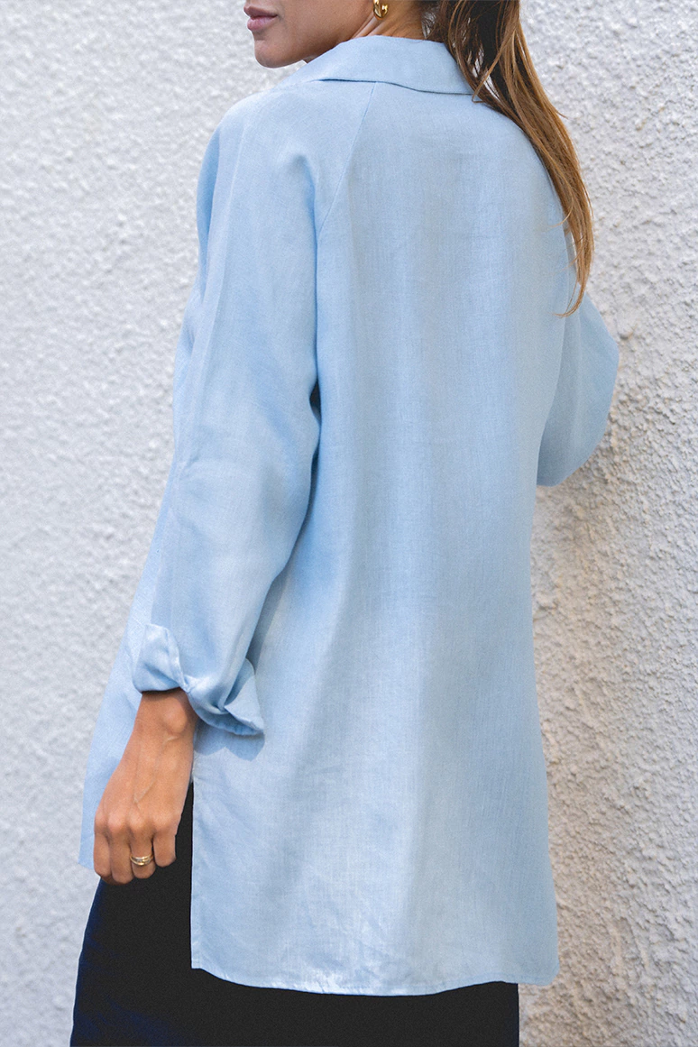 Peça feita em 100% linho, fibra 100% natural, trazendo frescor e respirabilidade às peças. Possui caimento naturalmente mais estruturado do que outros tecidos, o que dá um toque de elegância ao look. É considerado também um dos tecidos mais sustentáveis do mundo.