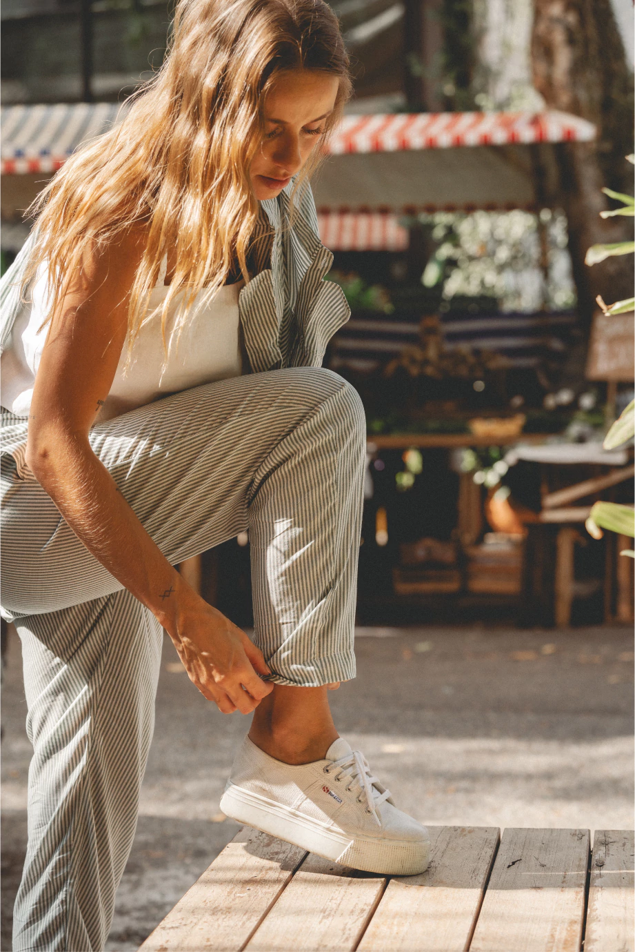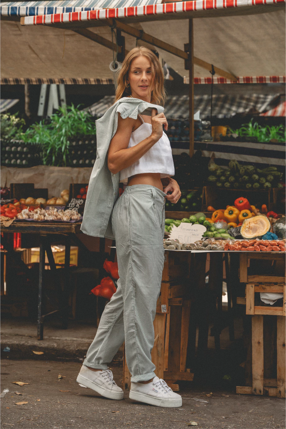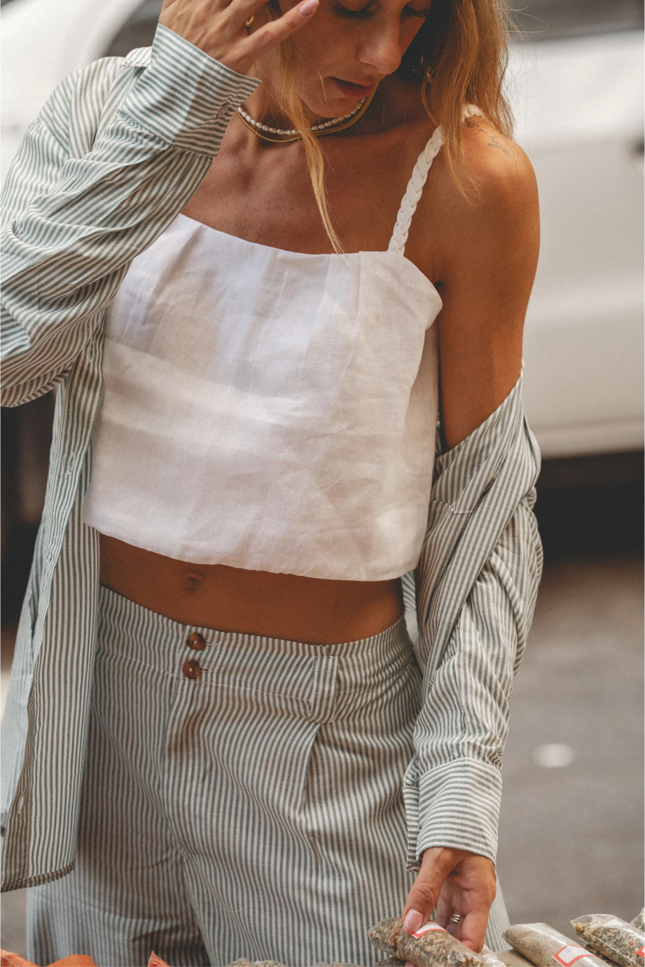 Peça feita em 100% linho, fibra 100% natural, trazendo frescor e respirabilidade às peças. Possui caimento naturalmente mais estruturado do que outros tecidos, o que dá um toque de elegância ao look. É considerado também um dos tecidos mais sustentáveis do mundo.