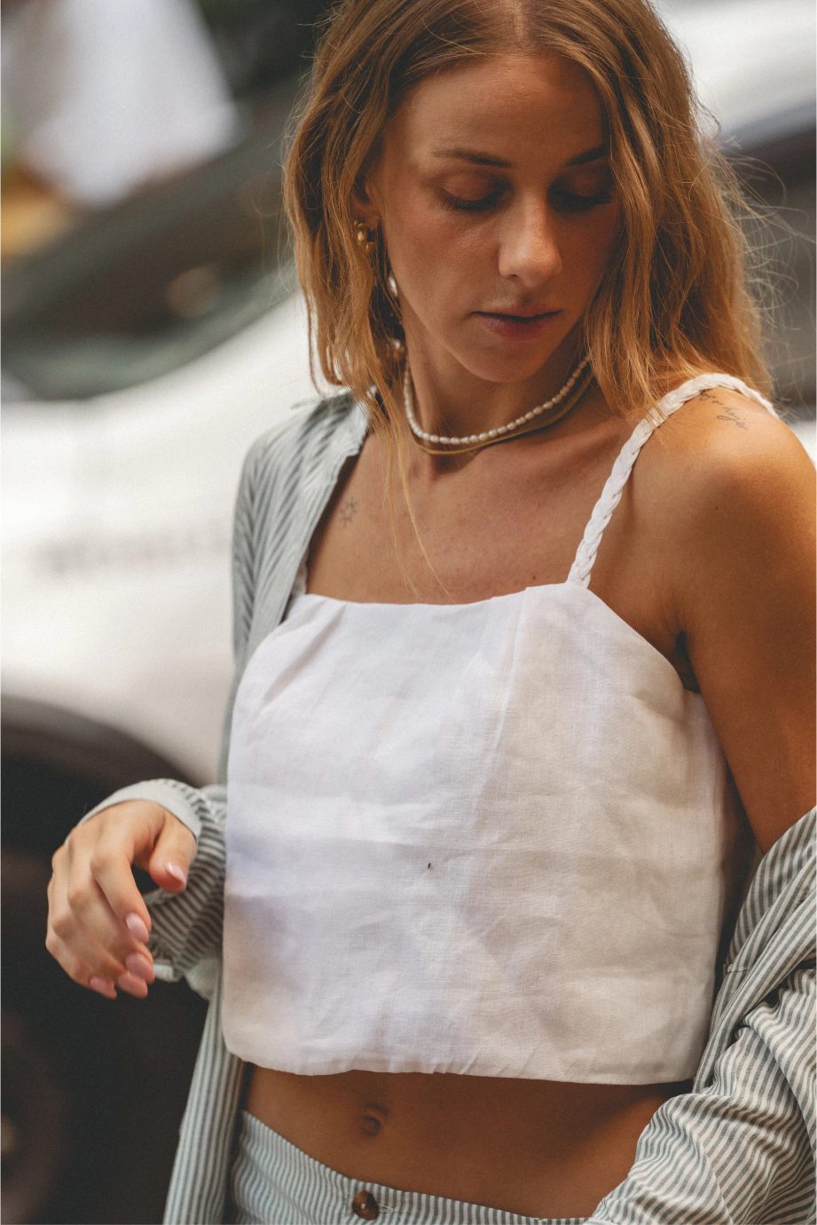 Cropped de alça fina trançada com o próprio tecido e decote reto.