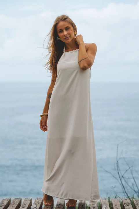 Vestido frente única em tecido 100% viscose, com detalhe torcido no decote e fechamento com laço nas costas. Peça forrada.