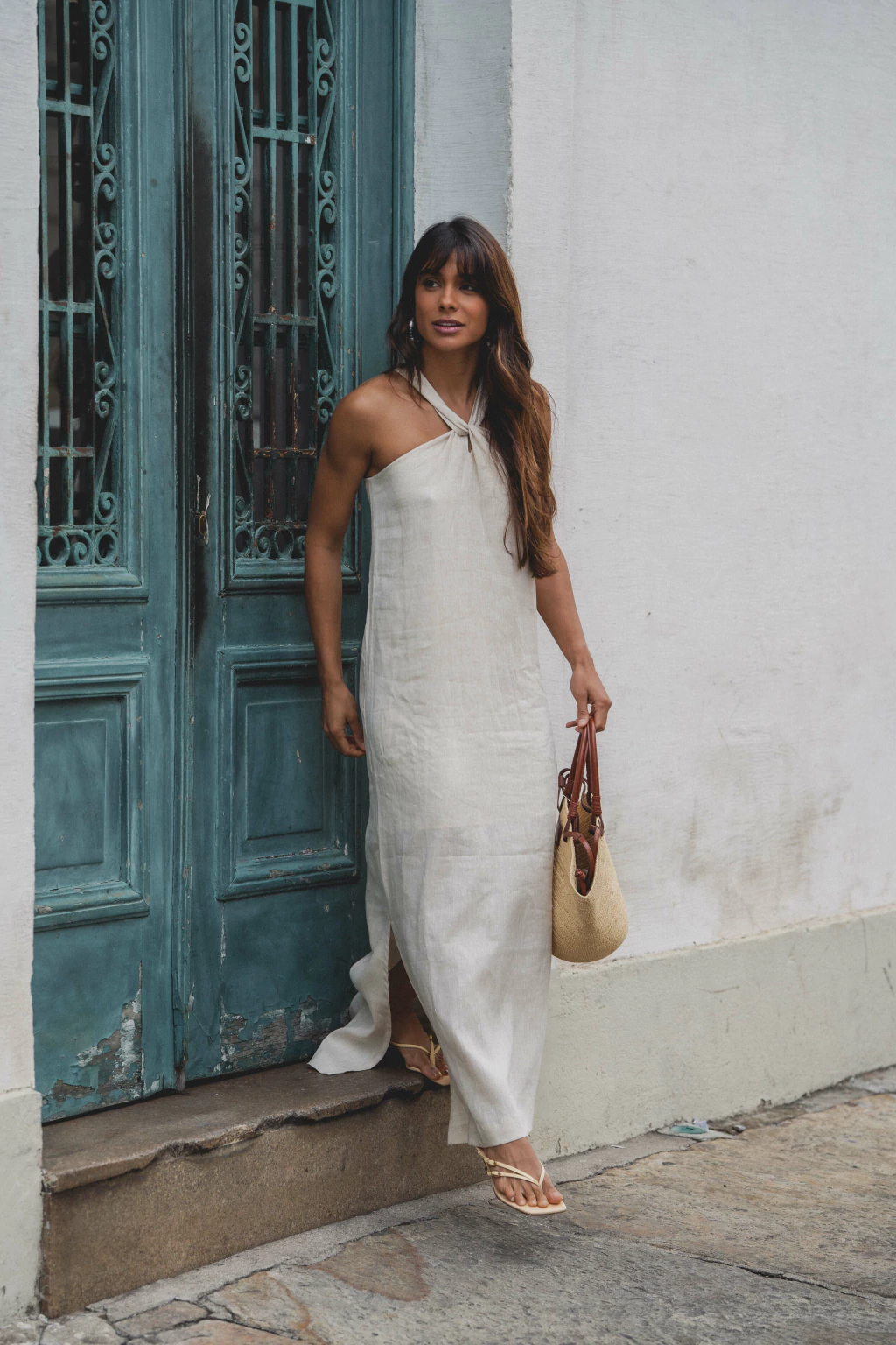 Vestido com modelagem solta, decote com detalhe transpassado e fenda nas laterais.