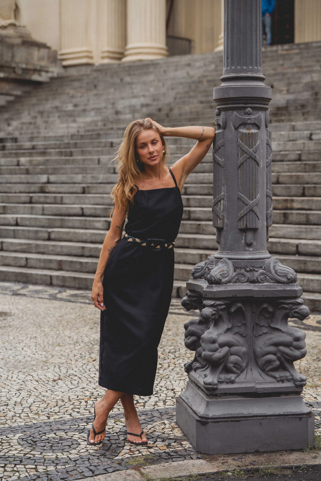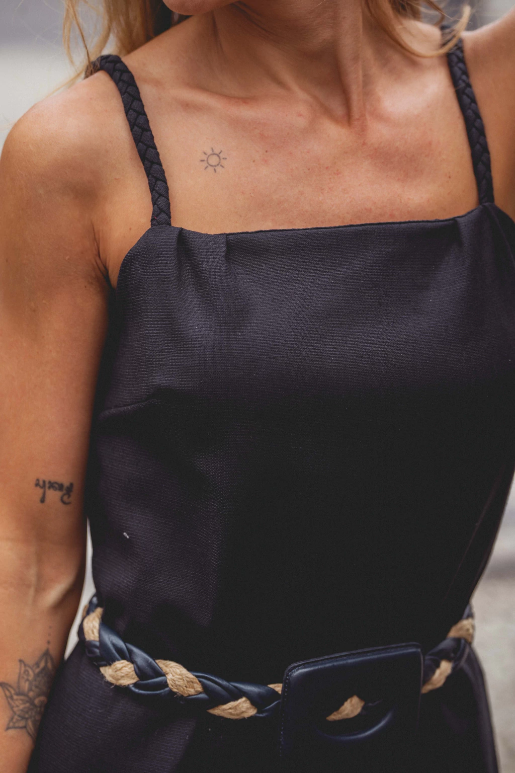 Vestido midi com shape tubo levemente solto em viscose com linho, detalhe de alças trançadas, fechamento com zíper invisível e fenda nas costas.